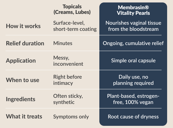 Lubes, creams, vaginal moisturizers… they help for a few minutes. But they don’t fix the deeper issue: your body’s natural moisture is fading because your mucosal tissue isn’t being nourished the same way anymore.