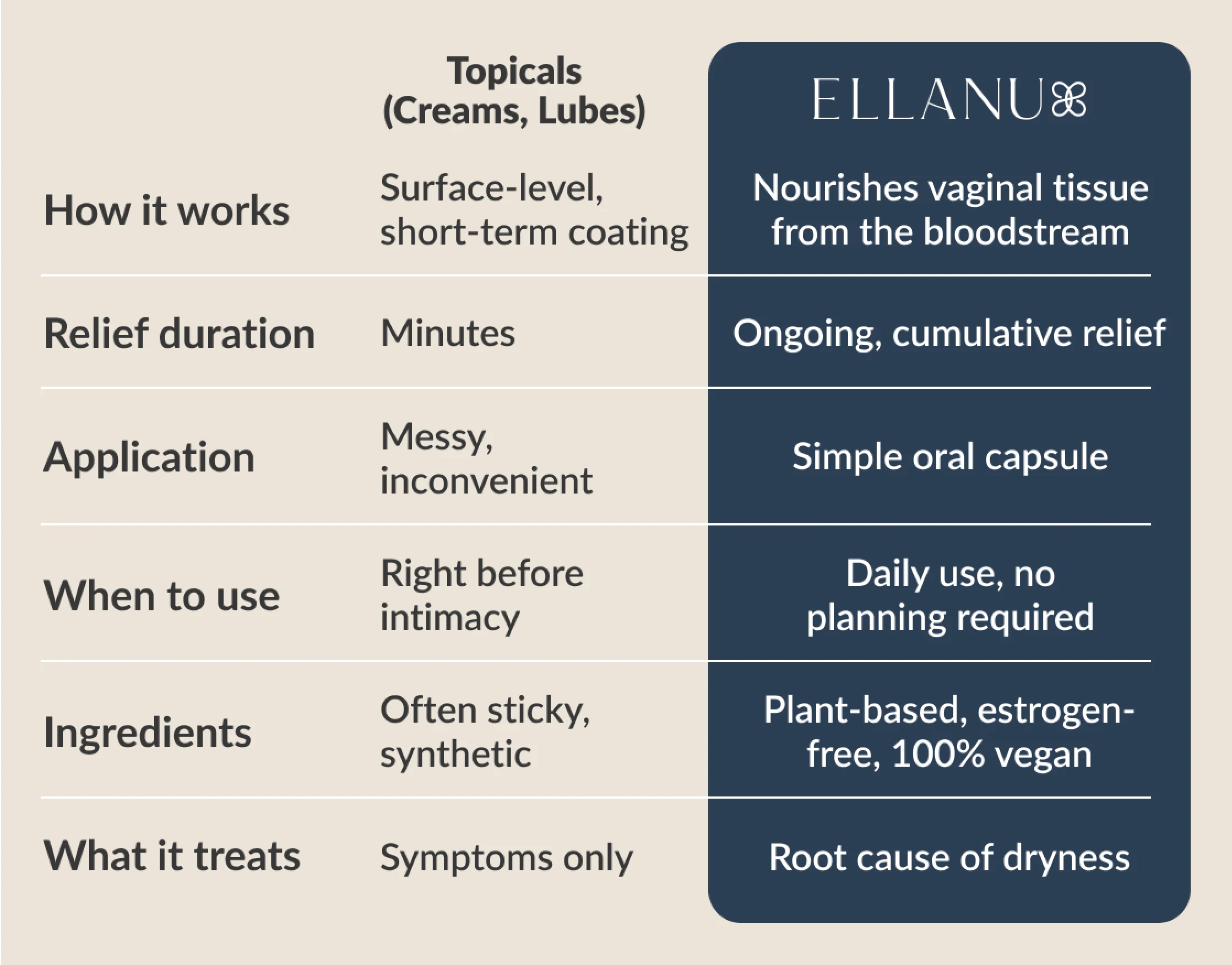 Try EllaNu, the only internal, estrogen-free solution clinically shown to relieve vaginal dryness from the inside out.
